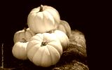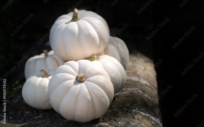 Close-up of white pumpkins standing on a historic stone wall against a dark background.