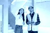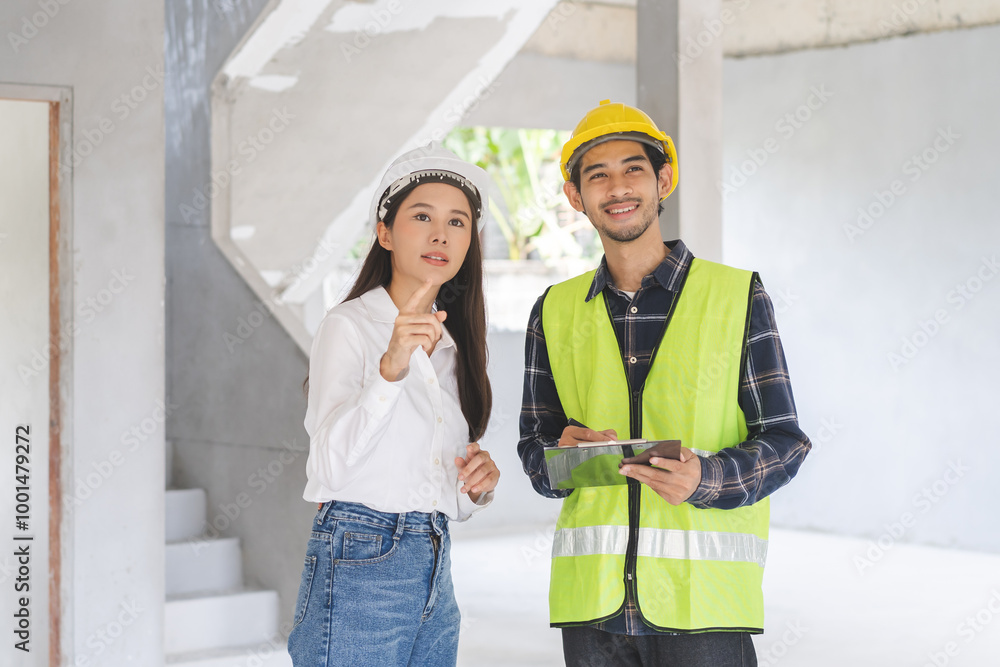Builder team, foreman asian young engineer, architect man, woman working, discussing construction drawing on clipboard follow project to build industrial plan at house site. Engineering worker people.