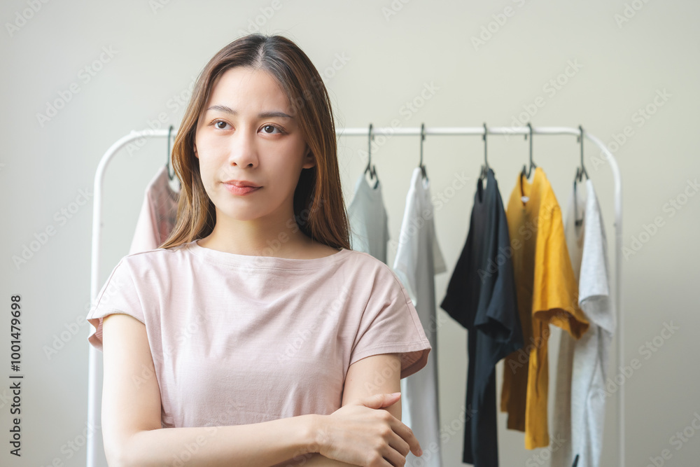 Choice of clothes, girl try on apparel, worry choosing dress, Nothing to wear. Attractive asian young woman, outfit on hanger, wardrobe in room closet at home. Deciding blouse what to put on which one
