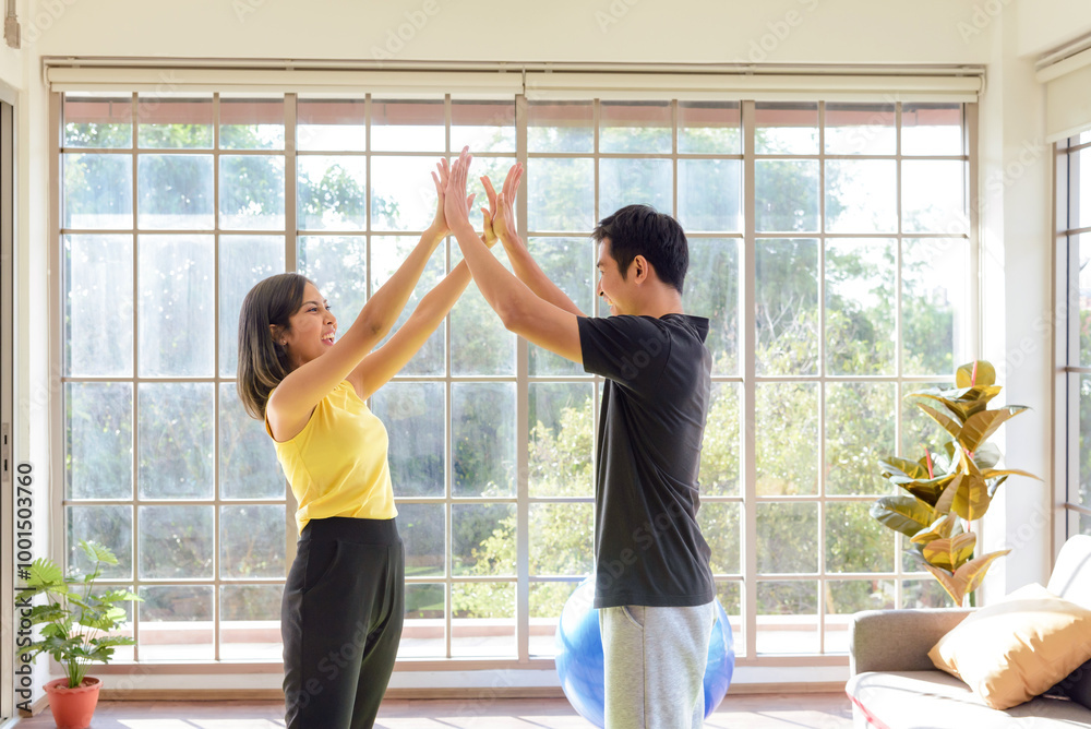 Young asian couple wear casual clothing giving high five to each other and smiling in liveing room.