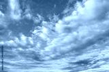 Cloudy blue sky with fluffy clouds lit by sunlight - natural cloudy sky background, panoramic view of blue cloudy sky