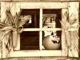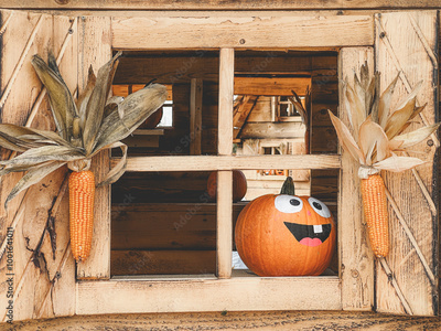 Festive Halloween Pumpkin with Corn Decorations in Wooden Window