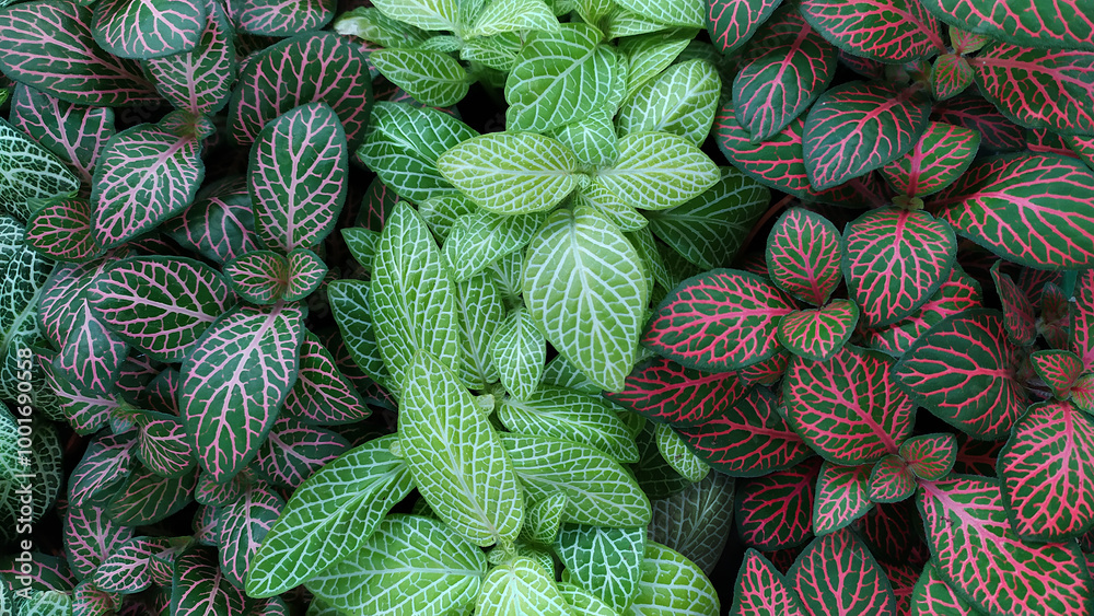 Different color plants of Fittonia is a decorative foliage plant of tropical region. Natural background.