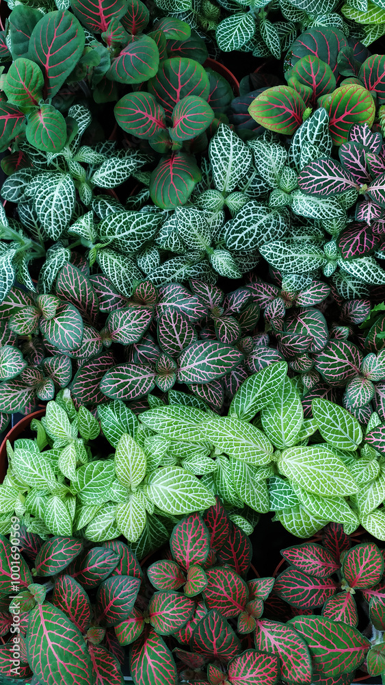Different color plants of Fittonia is a decorative foliage plant of tropical region. Natural background.