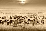 Zebra and wildebeests group with amazing sunset in african savannah. Serengeti National Park, Tanzania. Wild nature african landscape and safari concept