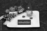 Tischdekoration zur Weihnachtsfeier. Kerzen mit Tannenzweigen und ein Tischgedeck.