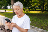 Joyful senior woman with short gray hair smiling looking mobile phone screen, laughing watching funny video on internet, browsing photo, having fun online, reading good news using smartphone outdoor