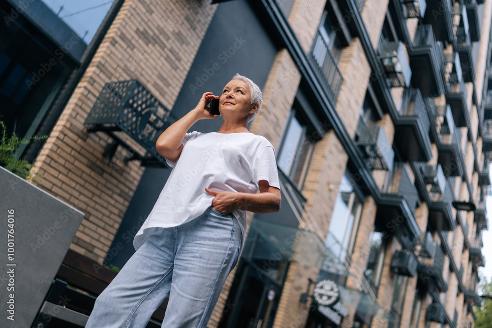 Low-angle view of beautiful mature grey-haired smiling woman in white clothes standing on fresh air talking on phone laughing speaking. Fashionable elderly female communicating using smartphone.