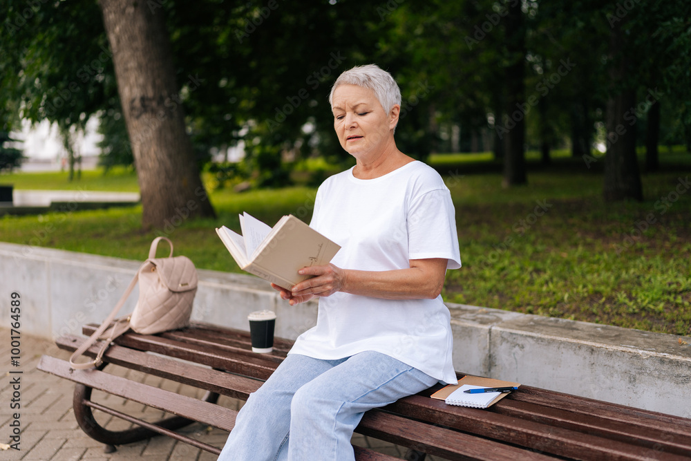 Peaceful aged woman with short gray hair reading paper book in park, enjoying nature and tranquility, embodying relaxation and wisdom in retirement. Elderly female enjoying free time in retirement.