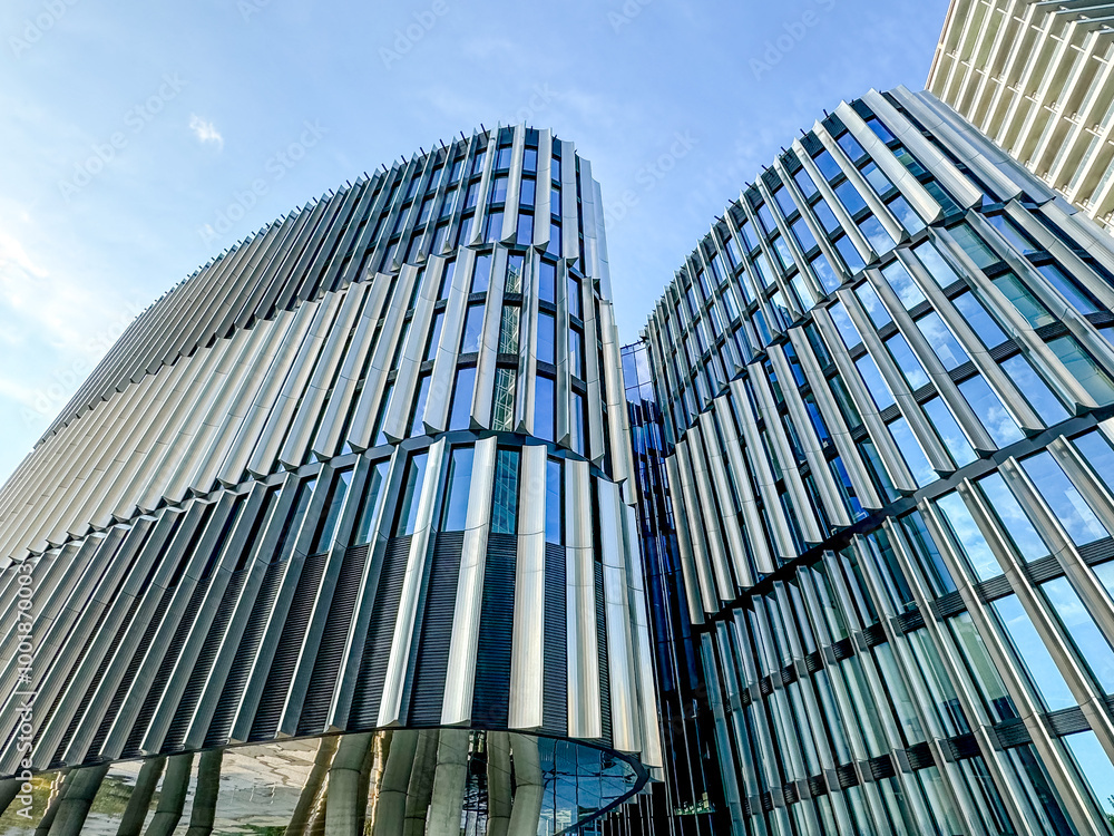 Prague, Czech Republic - July 19, 2024: Morning views of modern office towers and residential buildings on the outskirts of Prague in the Czech Republic