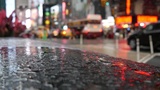 New York City Times Square, Manhattan Midtown Broadway street, USA. American NYC urban life. Wet road on autumn rainy day, traffic defocused. People pedestrians, Yellow taxi cab. Commercial billboards