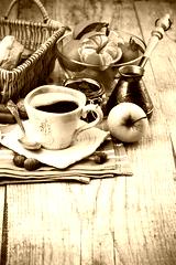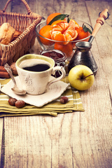 Cup coffee breakfast rustic style on wooden board