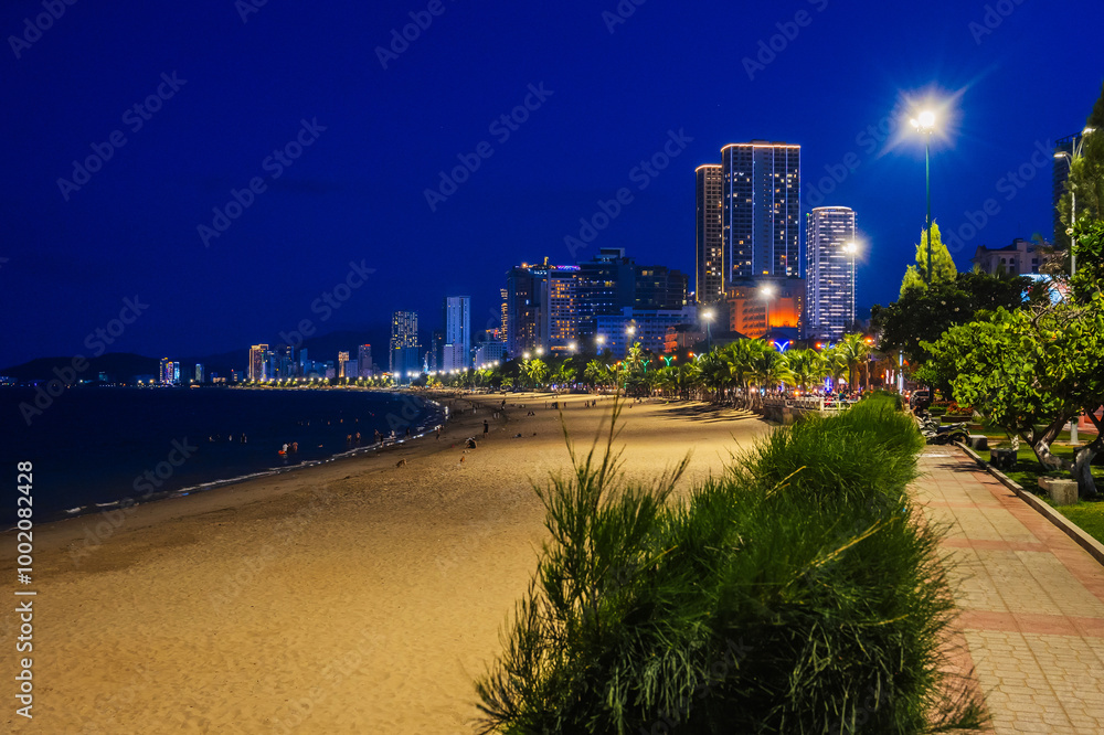 An embankment and a sandy beach by the sea with views of skyscrapers and hotels at night. Panorama of Nha Trang city in Vietnam