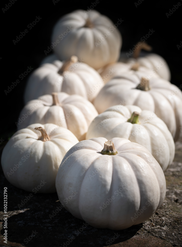 Close-up of a group of white pumpkins in portrait format. The pumpkins are on an old stone wall. The background is dark.