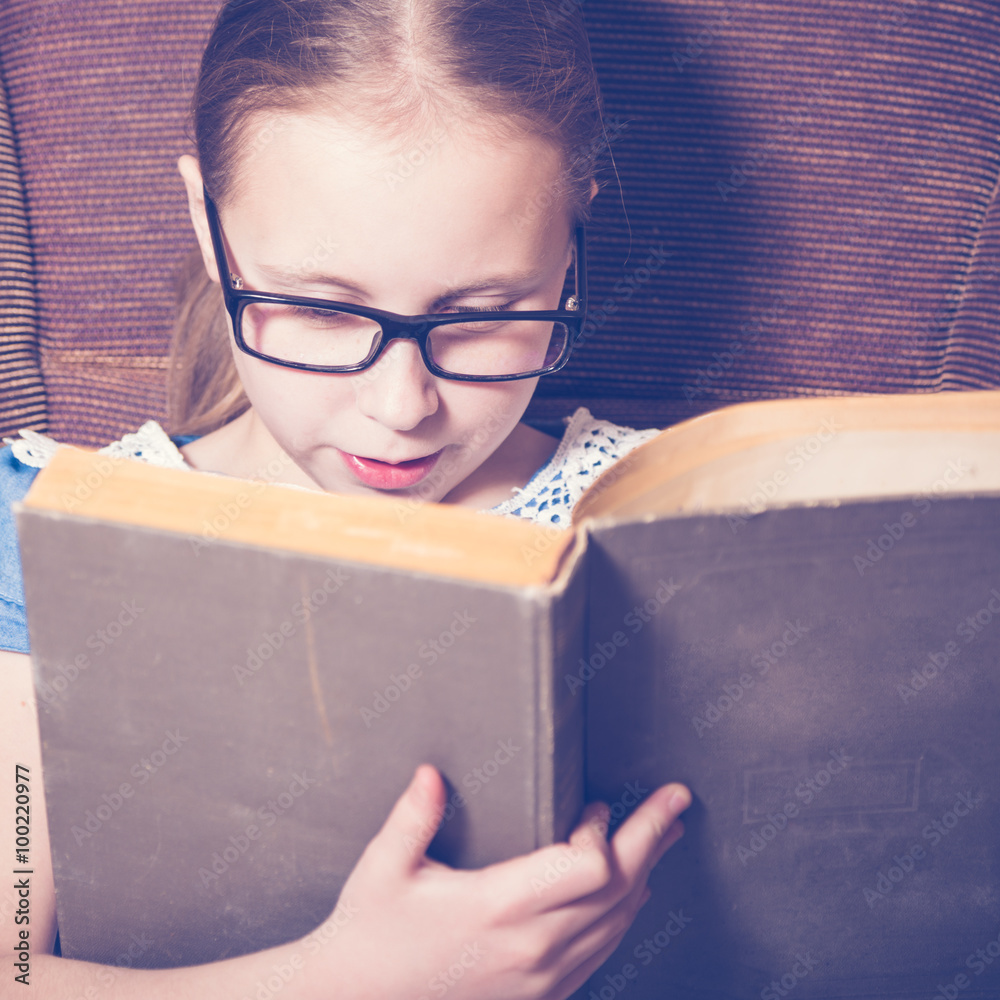 Girl reading a book at home sitting in an armchair.