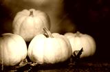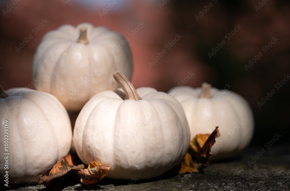 Close-up of a group of white pumpkins in landscape format. The pumpkins are on an old stone wall. The background is red with some blue sky. Dry leaves lie between the pumpkins.