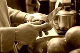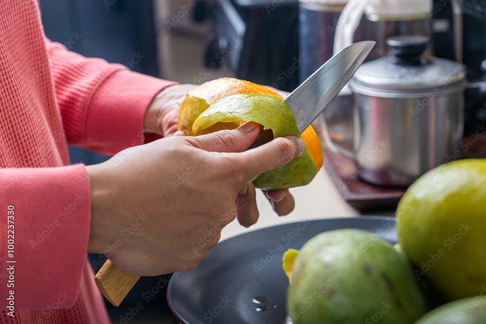 woman peeling ripe and juicy mango fruit with a sharp knife in the kitchen