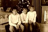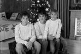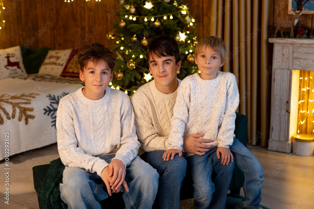 Sweet children, cute boys, brothers, playing with christmas toys on Christmas, beautifully decorated home for Christmas, cosy place