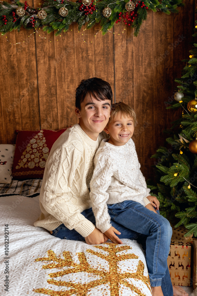 Sweet children, cute boys, brothers, playing with christmas toys on Christmas, beautifully decorated home for Christmas, cosy place