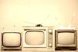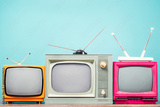 Retro TVs set on table front mint blue background. Vintage old style filtered photo