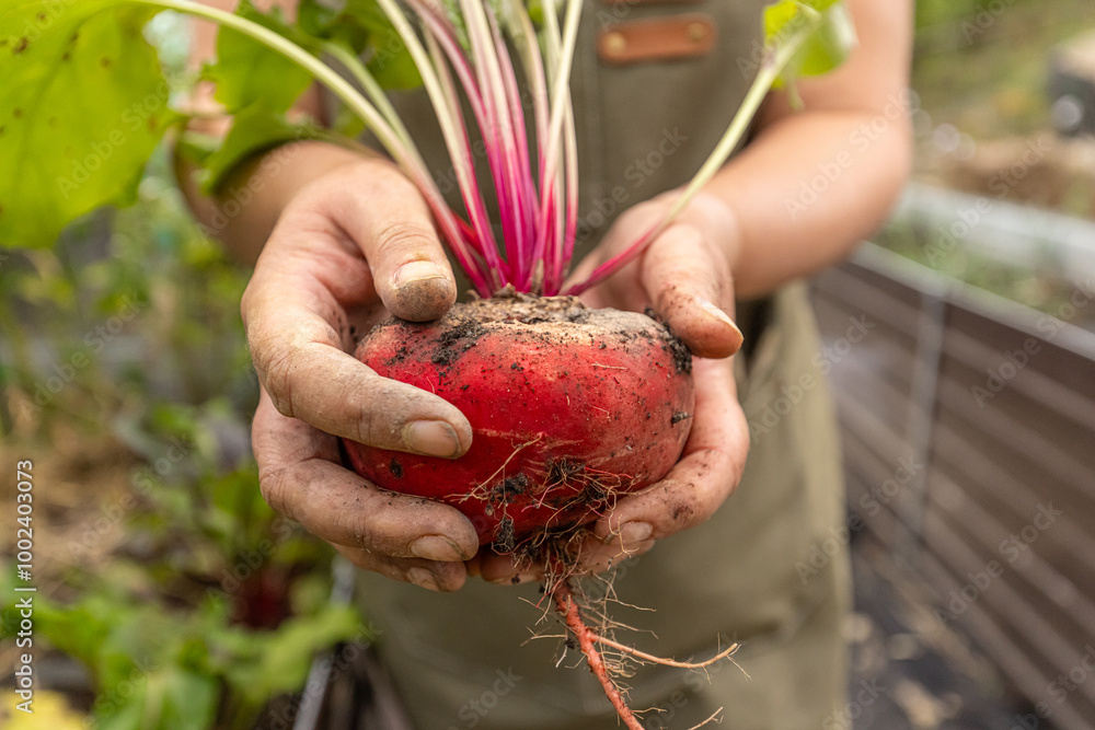 Farmer holding beetroot in garden