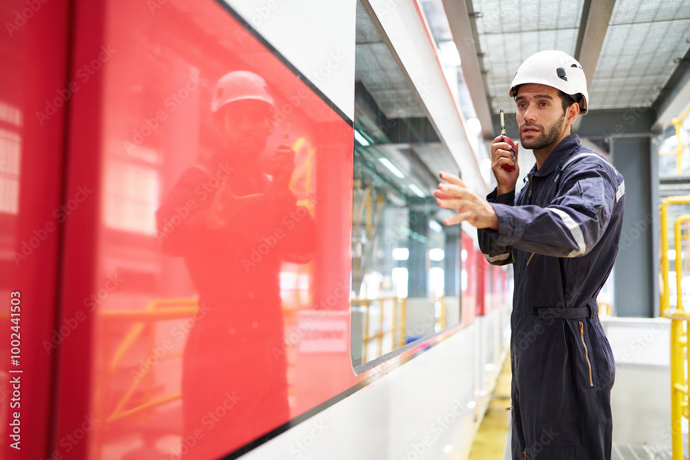 Technician or worker talking about work on walkie talkie and checking at construction train station