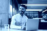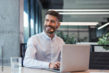 Male customer support operator with headset and smiling