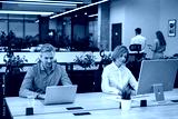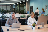 Businesspeople in formalwear working on laptop and PC in the modern office with collegues on the background.