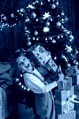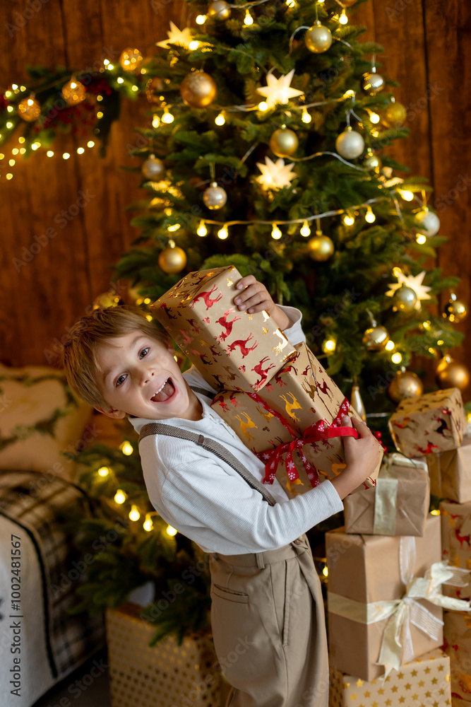 Sweet blond child, cute boy, playing with christmas toys on Christmas, beautifully decorated home for Christmas, cosy place