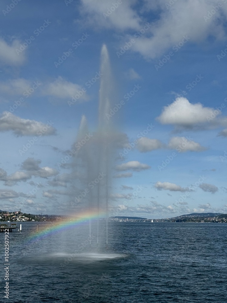 rainbow on the water fountain in horgen, zurich, switzerland, zurich lake