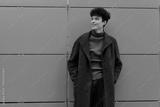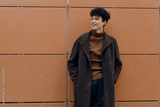 Fashionable young man in a brown coat and turtleneck sweater, smiling with hands in pockets, leaning against a wall