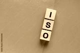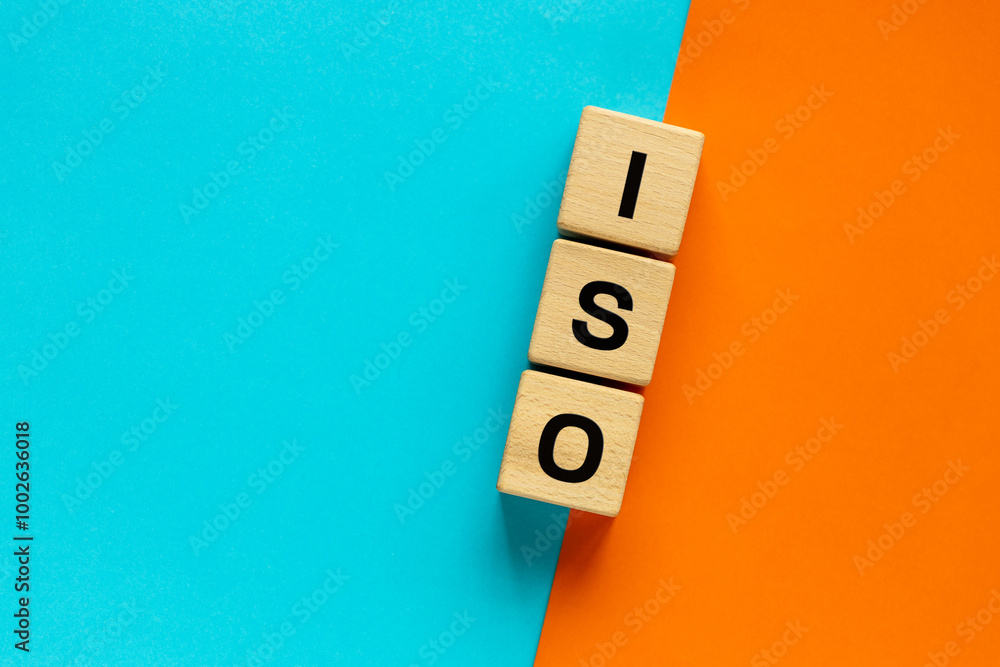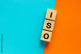 ISO 9001 certified concept. Text ISO on the wooden cubes. orange and white background. Quality control.