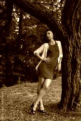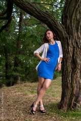 Slim young woman posing in the forest in a tight blue mini dress