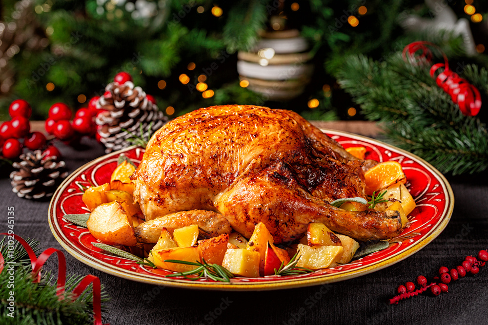 Christmas or New Year feast table, roasted chicken stuffed with apples and oranges and served on a beatiful red plate with baked potatoes, sage and rosemary. Fir tree, lights and decoration.