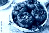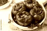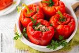 Close up of Red bell peppers stuffed with minced meat and rice and cooked in a tomato sauce in white casserole.