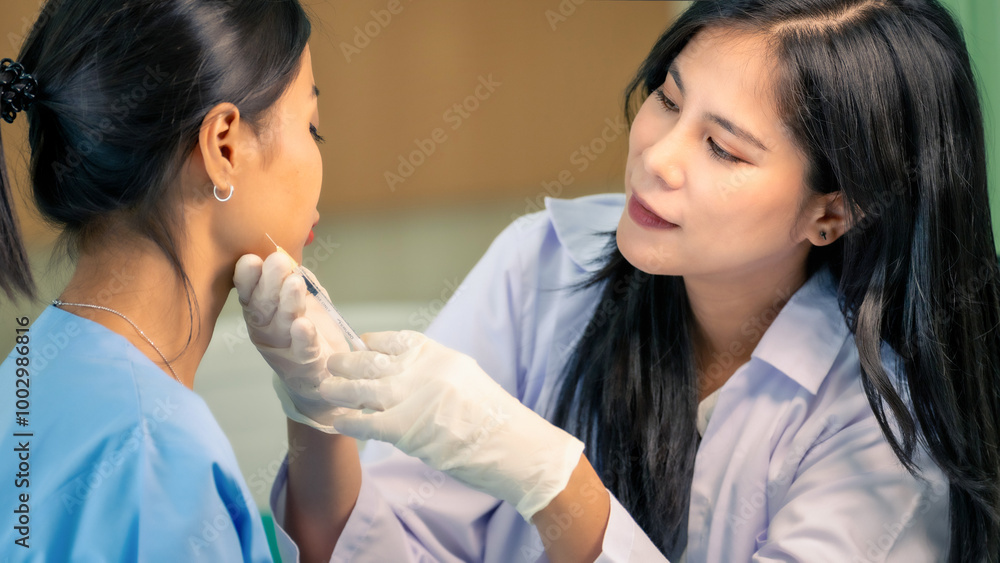 Beautiful young asian woman getting cosmetology treatment facial skin injection by doctor in beauty clinic.