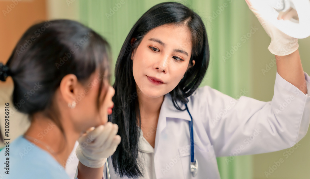 Professional woman doctor consultation in cosmetology clinic. Female professional beauty doctor talking with pretty young female.