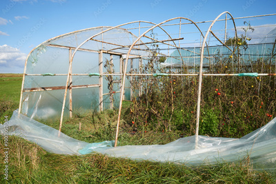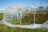 Greenhouse with organic vegetable crops damaged by storm.