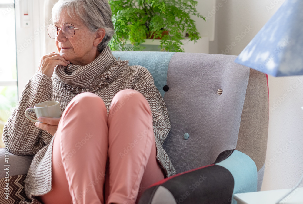 Smiling senior woman sitting on armchair and holding coffee cup. Caucasian female relaxing in cozy living room and having coffee.