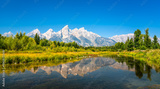 Breathtaking view of the Grand Teton Mountain Range reflecting in the calm waters of the Snake River, captured in Wyoming, United States
