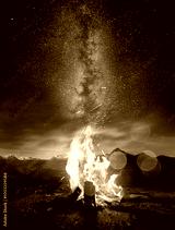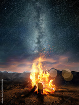 Watching the stars around a glowing cosy warm campfire at night. Photo composite.