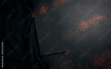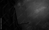 Empty black wooden cutting board and linen kitchen towel, top view. Copy space