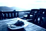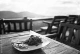 Food. Dinner In Thai Restaurant Outdoors. Healthy Noodles with sea food. Meal On Wooden Table. Beautiful Landscape, View, Hills On Background. Travel To Luxury Tropical Resort.