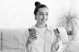 E-banking concept. Cheerful pretty brunette woman, sits on a sofa in a living room, holds smartphone and credit card for online payment in a mobile app, making online shopping, looking away, smiling