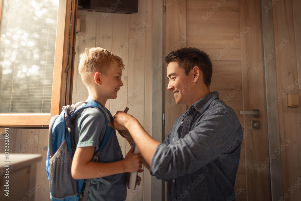 Young happy father getting son ready for school, father and child spending time together. family candid lifestyle.
