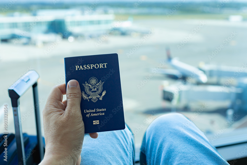 person with passport and ticket at airport , business, holiday travel