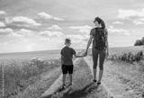 Happy mother and child holding hands walking down country road, family adventure, travel holiday concept