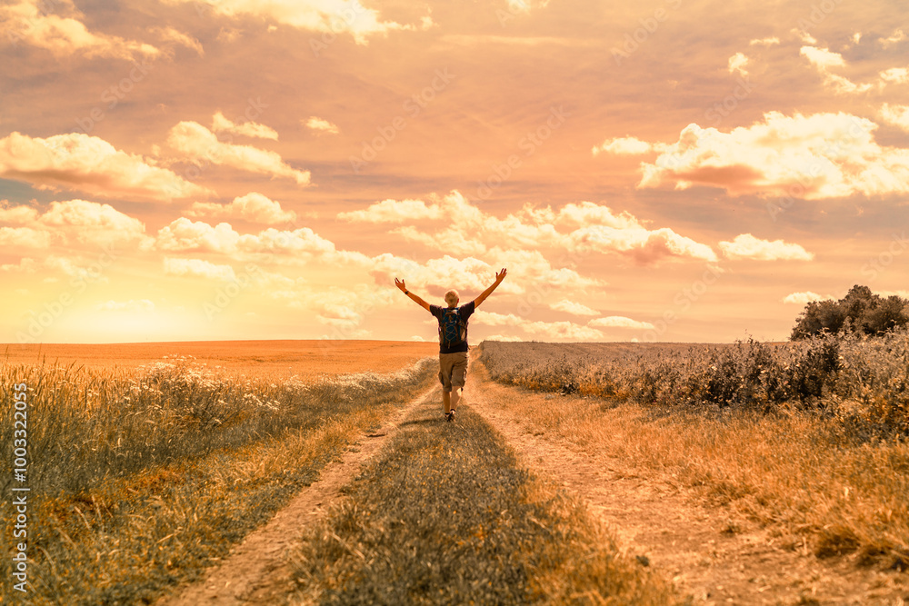 Happy senior man hiking walking through the countryside feeling free joyful in nature