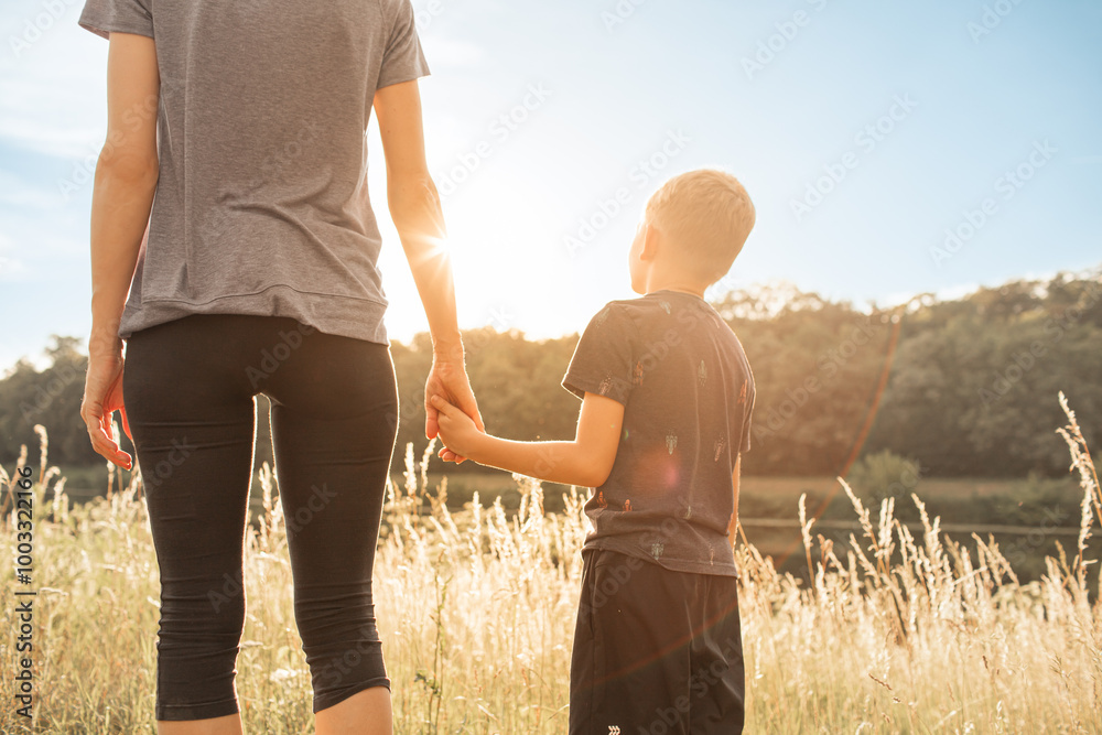 Mother little son holding hands walking in a grass field meadow at sunset.