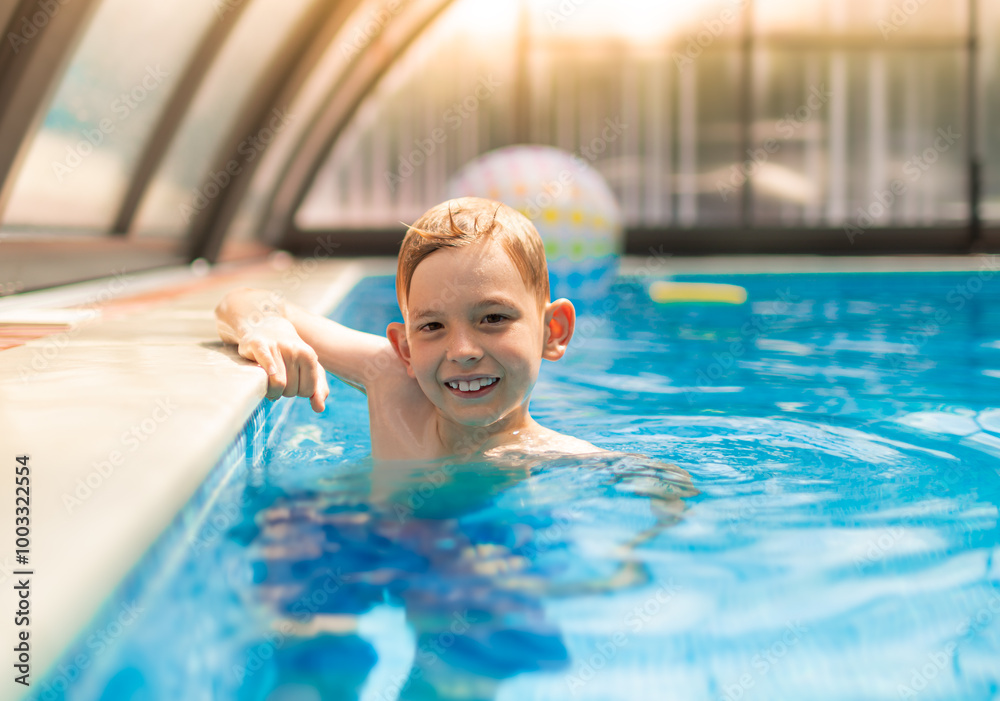 Portrait of happy child in swimming pool enjoying holiday summer vacation